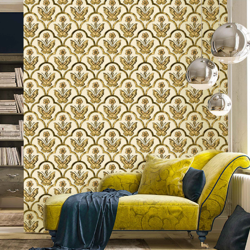 Palette: Shimmering gold and ochre tones set against a warm, buttery yellow or cream background, adding a sun-drenched, radiant feel to the room.