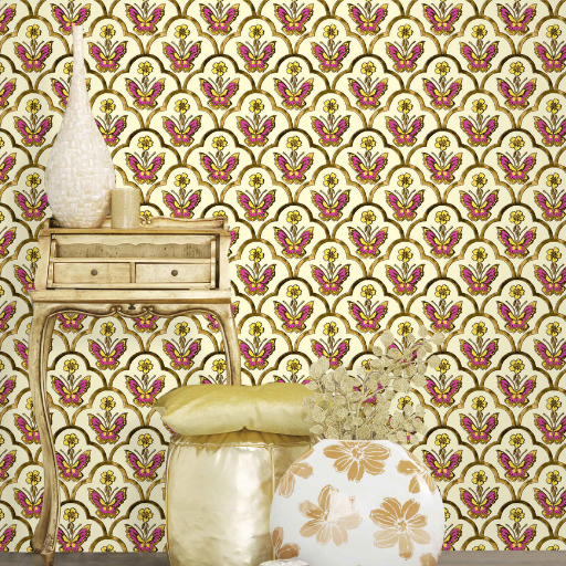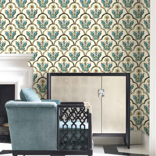 This elegant wallpaper features a refined Butterfly and Floral Damask design, blending classical motifs with a whimsical, nature-inspired touch. The pattern is characterized by its symmetrical, arched frames that create a structured “trellis” or “scalloped” effect, making it an ideal choice for creating a sophisticated feature wall.