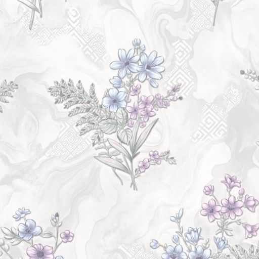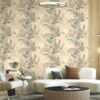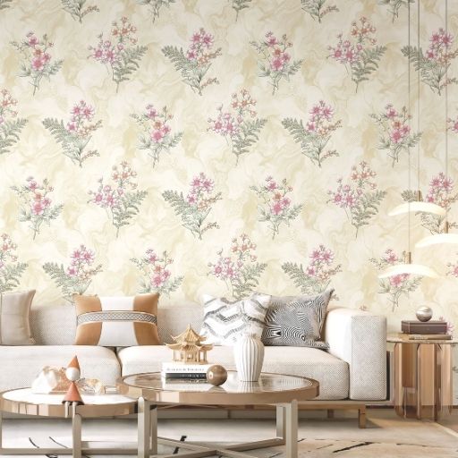 This wallpaper features a delicate and airy botanical design, blending classical elegance with a soft, modern color palette. It is an ideal choice for creating a serene, sophisticated atmosphere in living areas, bedrooms, or boutiques. A repeating floral sprig motif featuring clusters of small pink blossoms and detailed green ferns.