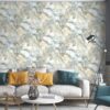 Rendered in soothing shades of slate blue, steel grey, and soft ivory, this wallpaper adds a calm yet luxurious ambiance—perfect for bedrooms, living areas, or boutique interiors. The subtle tonal variations give the wall a handcrafted, artisanal feel, while the repeating geometric pattern ensures a balanced and refined look.