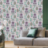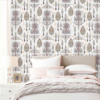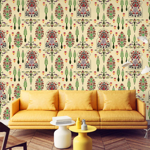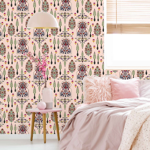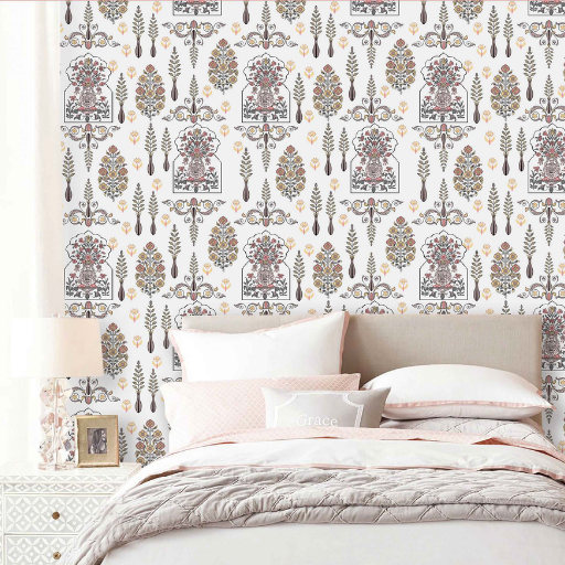 Regal Mughal Motif (8018): This design features a structured layout of ornate floral vases and botanical pillars. Set against a crisp white background, the palette includes sophisticated shades of dusty rose, sage green, and ochre gold, making it an ideal choice for a feature wall in a bedroom or dining area.